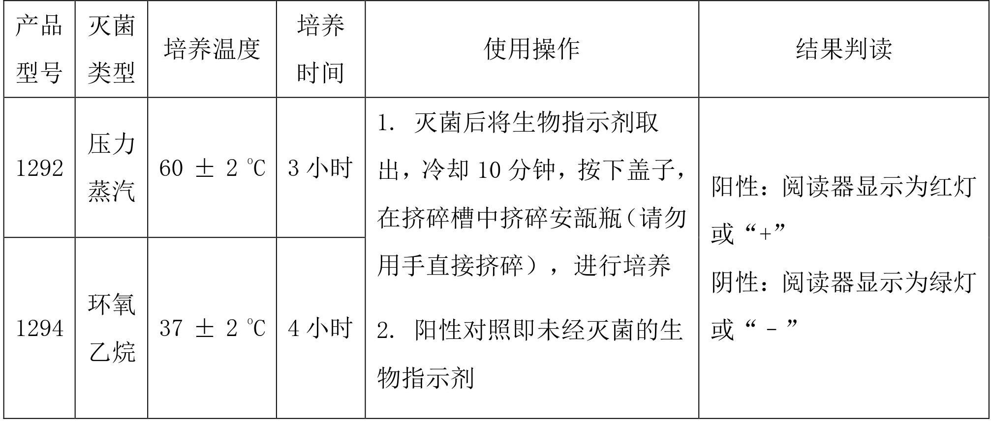 2. 自含式快速型生物指示劑的原理與普通型有所不同。菌株在增殖過程中,會分泌葡萄糖苷酶,該酶會特異性的分解培養液中非熒光底物,釋放出熒光物質,配套的自動閱讀器就可以探測出熒光,給出生物培養結果。由于酶具有高效性和專一性,在早期菌株增殖過程中就可以靈敏地探測到結果,因此快速型生物指示劑得到結果的時間明顯比普通型生物指示劑短。快速性生物指示劑具有高度靈敏性和準確性,用戶完全沒有必要進行延長培養。結果判讀見附表2,同普通型生物指示劑相類似,培養過程必須設置陽性對照,陽性對照培養結果為陽性才有效。