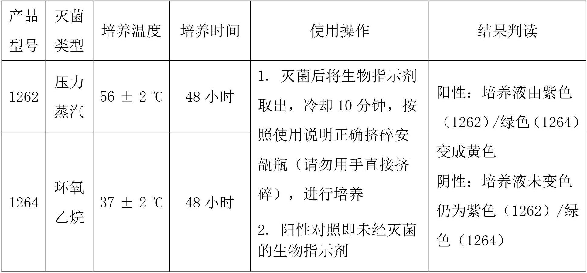 1. 自含式普通型生物指示劑,內含有高抗力的芽孢。芽孢在復蘇、增值過程中,會產生酸性代謝產物,由于培養基中含有pH敏感的染料,在酸性條件下就會變成黃色。自含式普通型生物指示劑的結果判讀見附表1,在培養過程中必須設置陽性對照,即未經滅菌暴露的生物指示劑。設置陽性對照的意義在于確保培養條件和芽孢的發育能力正常,只有陽性對照為陽性,生物監測的結果才是有效的。